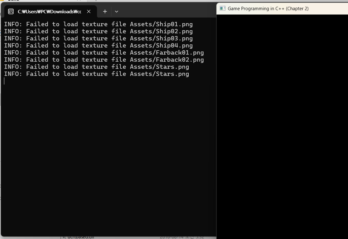 ▷ 이유는 위와 같다. 이 프로그램의 코드는 스프라이트 이미지(png 파일)을 위와 같이 상대 경로로 찾고 있다. 그런데 빌드된 결과가 생성되는 디렉터리에는 Asset 폴더와 그 이미지들이 없으니 오류를 뱉어낸 것이다. 빌드 디렉터리에 Assets 폴더를 복사해서 넣으면 정상 실행된다.
